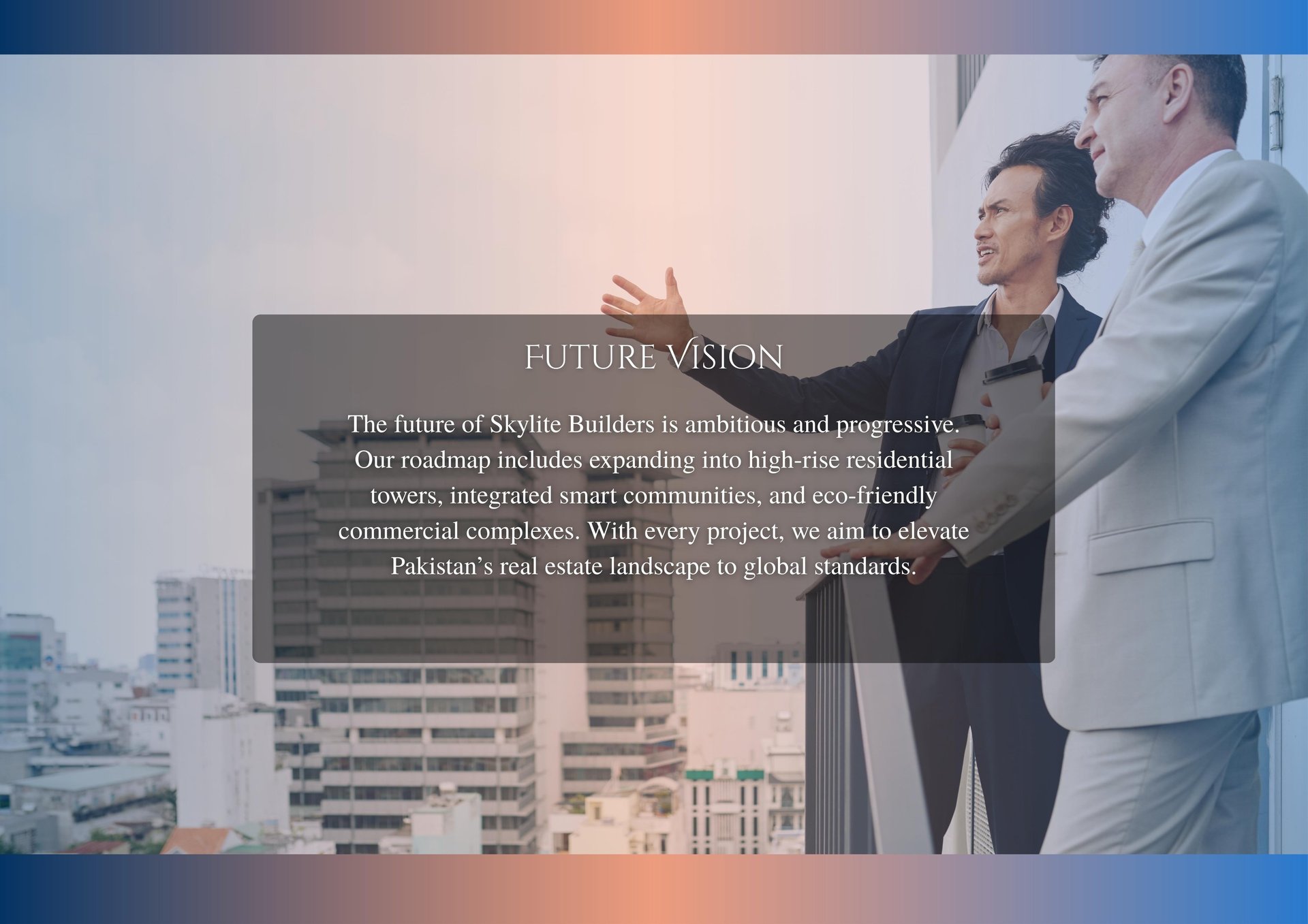 Our vision is to become a leading name in the real estate and construction industry of Pakistan, recognized for trust, creativity, and innovation. We aspire to build communities that reflect harmony, sustainability, and modern living, while leaving behind a legacy of excellence. By embracing new technologies and forward-thinking design, we envision Skylite Builders as a brand that transforms dreams into reality and sets new benchmarks for quality and reliability.
